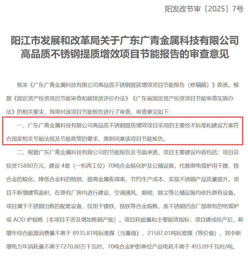 2025年10月15日,陽江市發展和改革局就廣東廣青金屬科技有限公司高品質不銹鋼提質增效項目節能報告作出審查意見,據顯示,該項目節能報告獲原則同意通過。